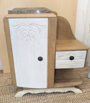 Mot-clés : chevet blanc vieilli, chevet bois et marbre, meuble ancien rénové, chevet vintage, mobilier seconde main, chevet artisanal, ameublement durable, chevet chambre adulte, chevet style ancien, chevet modernisé