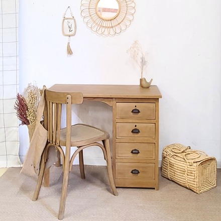 Ce joli bureau en hêtre entièrement rénové vous séduira par sa simplicité : son bois clair mis en valeur par un vernis incolore, des poignées d'origine délicatement patinées et sa petite tablette cachée, bien pratique pour gagner un peu d'espace.